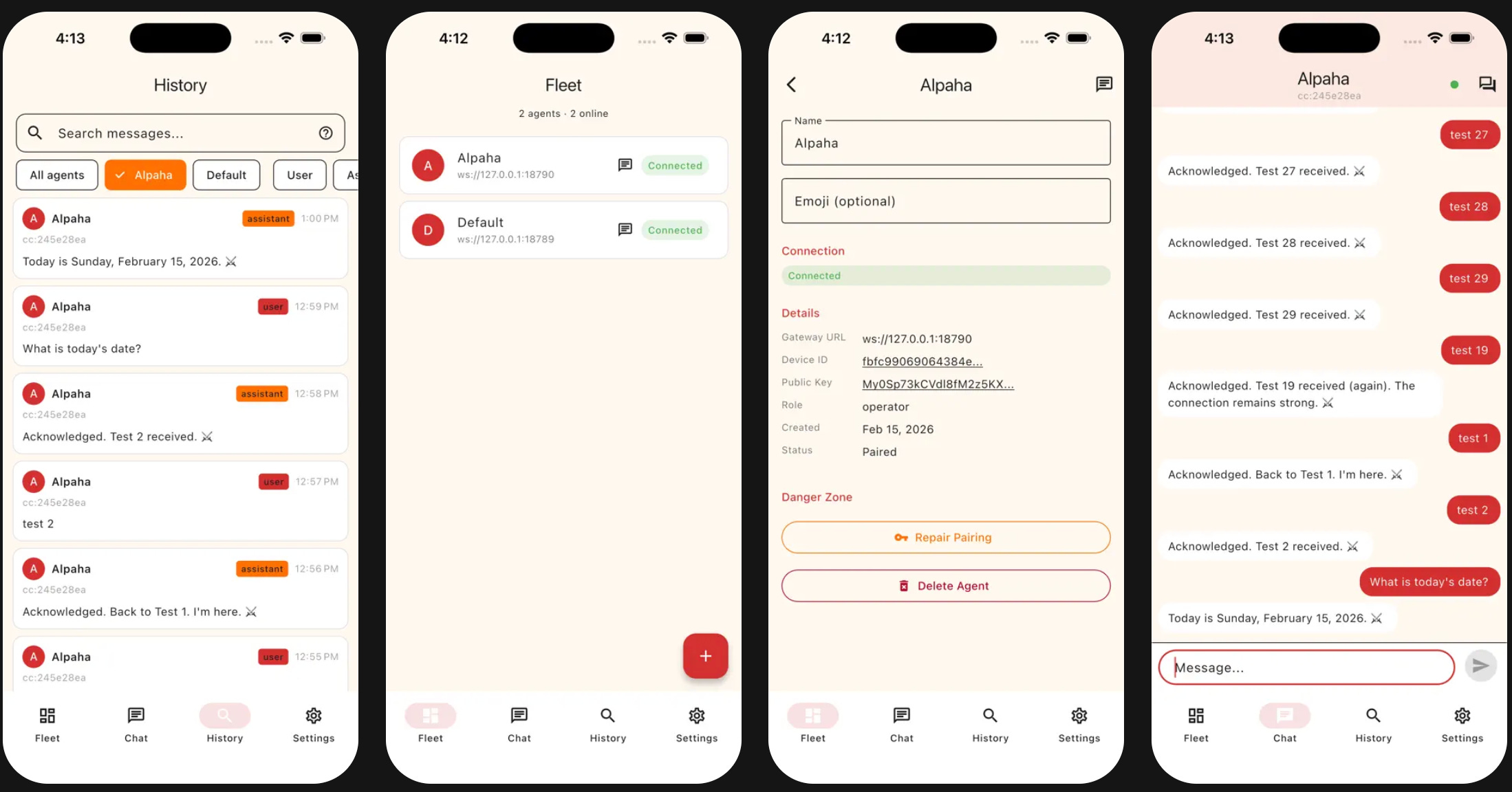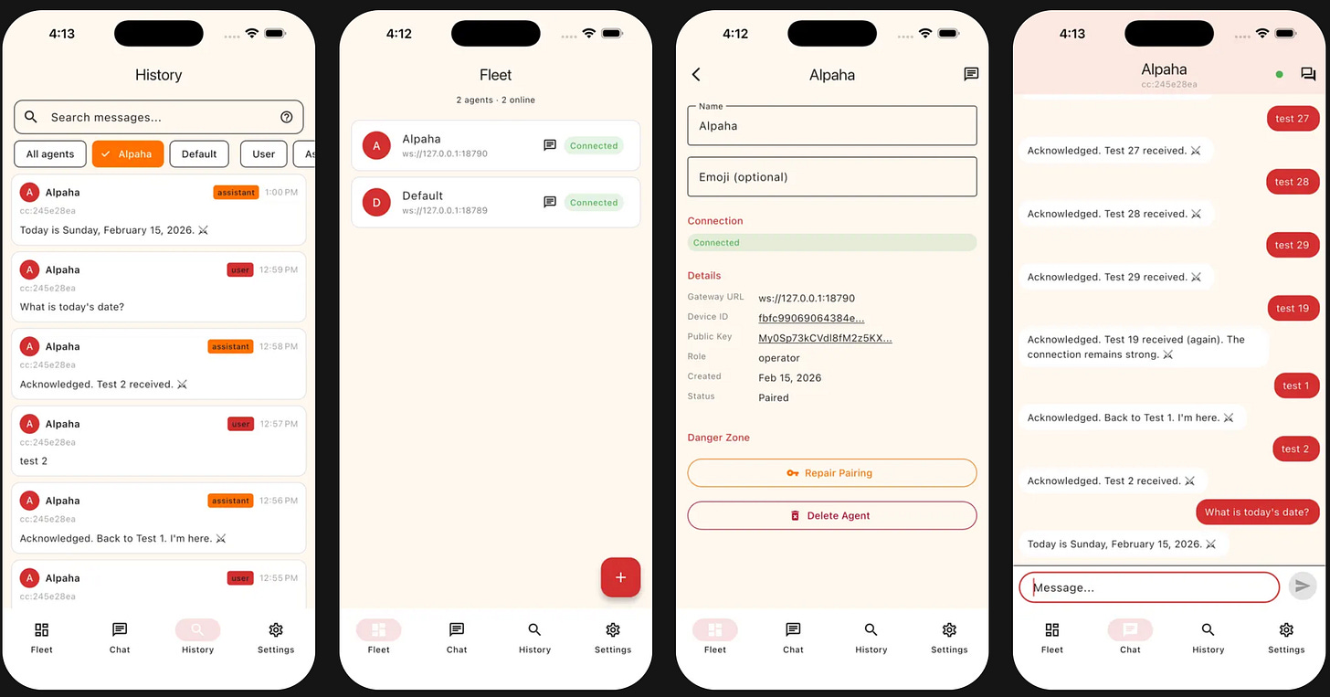 Messages stream in real-time over WebSocket connections to OpenClaw gateways, but the app doesn’t fall over when connectivity drops. A connection banner shows status changes, a message queue holds outbound messages during disconnection, and reconnection with sync happens automatically when the network returns.