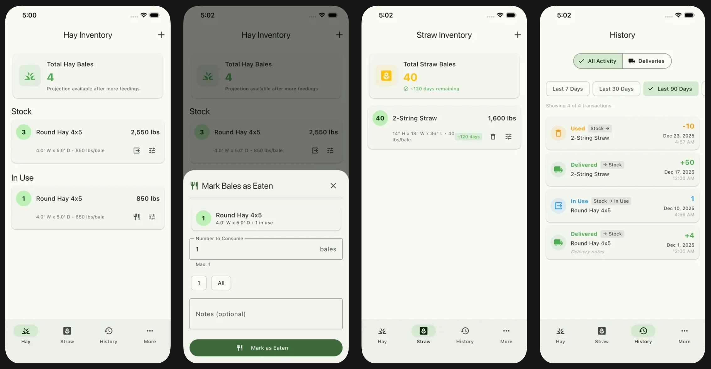 I wanted something simple: track deliveries, track usage, and build a history I could actually use for planning. HayTracker is that app.